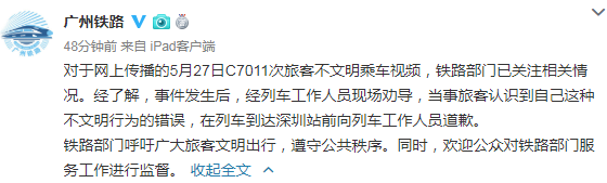 据中国铁路广州局集团有限公司官方微博5月31日消息,对于网上传播的5月27日C7011次旅客不文明乘车视频,铁路部门已关注相关情况。经了解,事件发生后,经列车工作人员现场劝导,当事旅客认识到自己这种不文明行为的错误,在列车到达深圳站前向列车工作人员道歉。