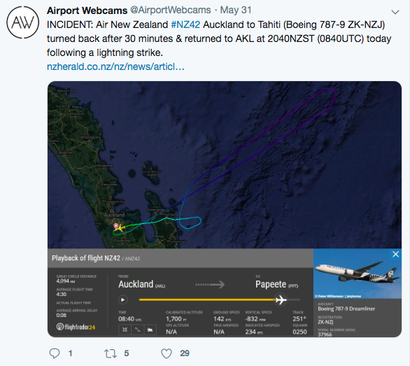 南都记者从该全球机场实时监测数据库获悉,NZ42航班(飞机型号为波音787-9)原定当地时间星期五晚上,从新西兰北部的奥克兰飞往位于南太平洋的塔希提岛,起飞后30分钟被闪电击中,被迫返航,于8点40分左右返回奥克兰机场。