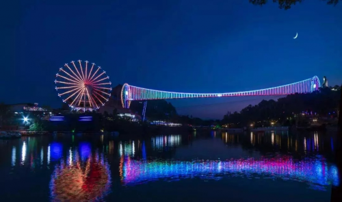 景区玻璃桥是一座带有扶梯的“3D开裂”玻璃桥。该桥由超大单体透明玻璃铺设。此外,夜间彩灯亮起的玻璃桥像一条霓虹彩带横跨隐贤湖。玻璃桥白天和晚上风景各异。