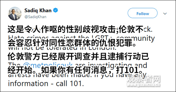 伦敦市长萨迪克汗(Sadiq Khan)谴责这一事件,称这是“令人作呕的性别歧视攻击”。他在推特上写道:“伦敦不会容忍针对同性恋群体的仇恨犯罪。”