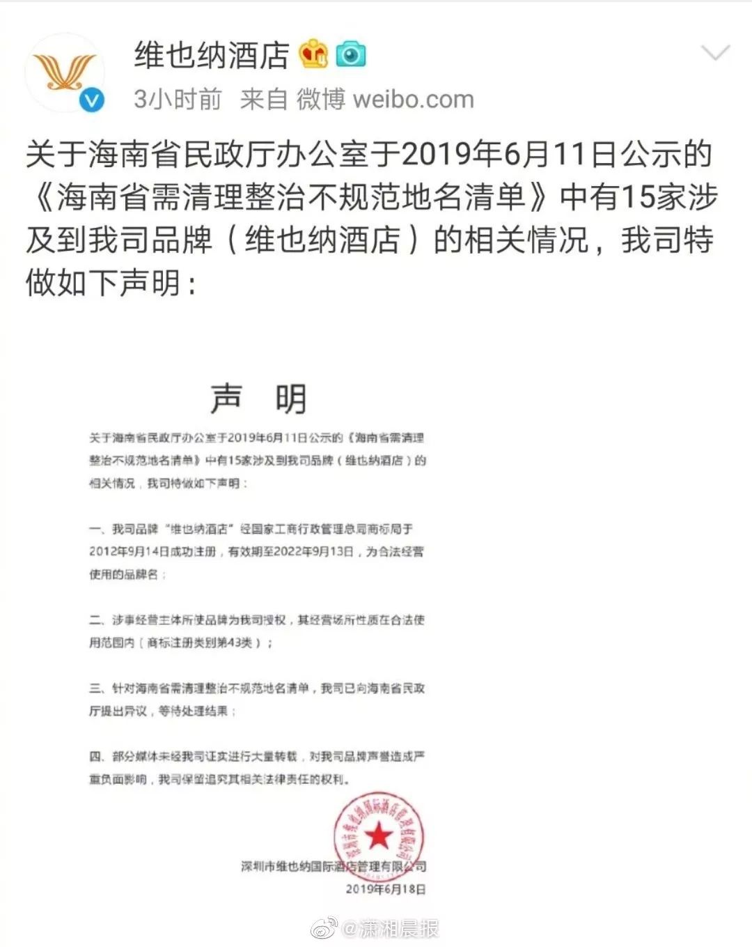针对海南省民政厅发布的清单,15个名称涉及维也纳酒店,深圳市维也纳国际酒店管理有限公司18日发布声明: