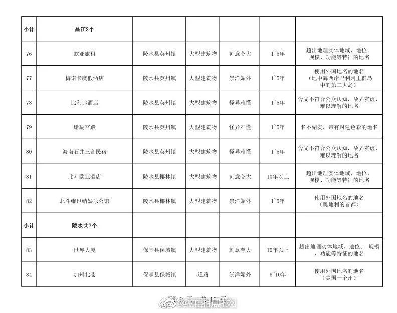 其中,中央海景大道商业街、钓鱼台别墅、太平洋别墅等因刻意夸大被列入清单;维多利亚花园、奥林匹克花园、塞维拉小区因崇洋媚外被列入清单;帝王花园小区、皇家骑士酒店等因怪异难懂、带有封建色彩被列入清单。