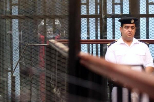 埃及前总统穆尔西(左)在开罗一法庭接受庭审的资料照片(2016年6月18日摄)。 新华社 图