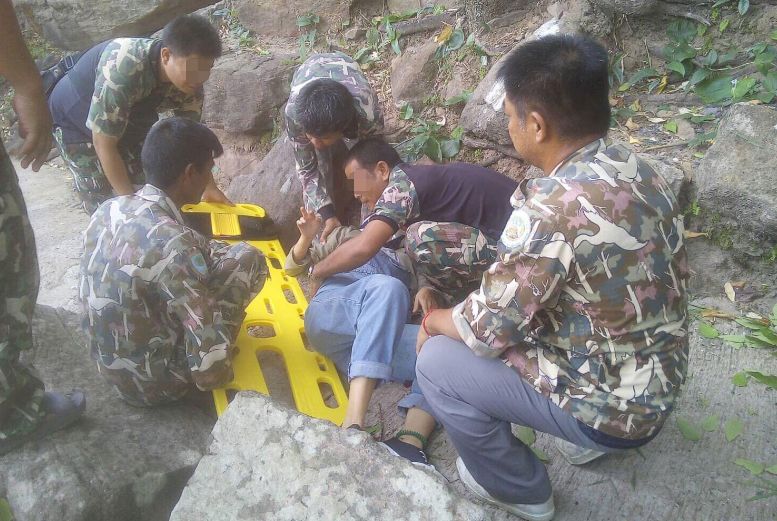 近日,一对中国夫妇到泰国孔尖县国家公园游玩,旅途中,妻子王女士竟然从34米高的悬崖跌落,身体有树枝划痕,左腿及两侧膝盖骨折,脸部受伤。