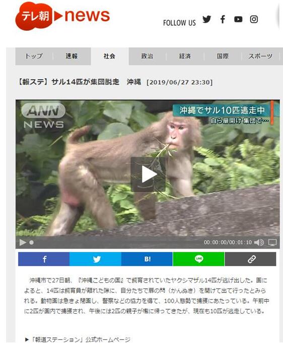 富士电视台:动物园14只猴子逃跑,目前仍在逃