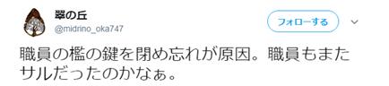 富士电视台也报道了猴子“越狱”事件。这家电视台援引动物园事务局长的话说:“猴子太聪明了,他们拿走了钥匙,不仅开了锁,还把铁门上的铁销打开,然后……”