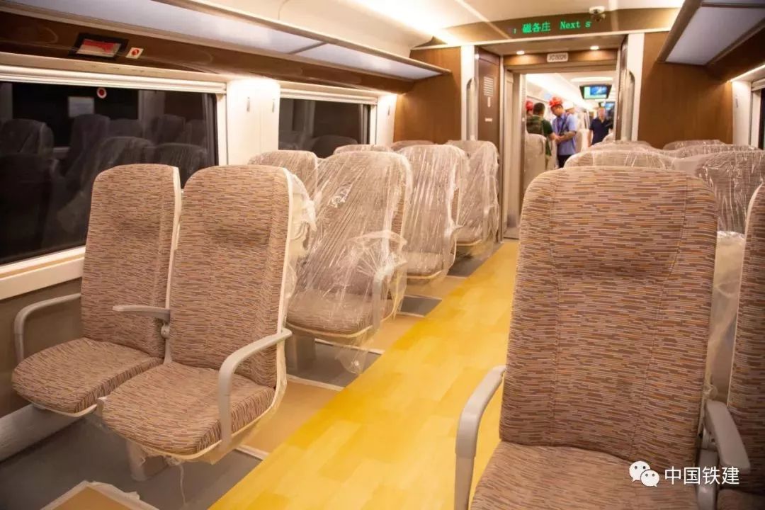 对标航空领域,首次采用载客车厢+行李车厢设置的“7+1”形式,全列定员448人,载客车厢分为普通车厢+商务车厢形式,座椅尺寸和间距超过“复兴号”高铁动车组二等座和一等座要求。