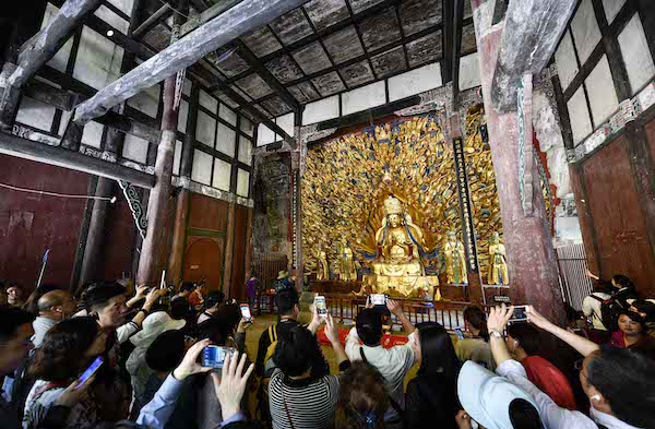 游客在大足石刻宝顶山景区参观千手观音造像。