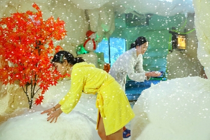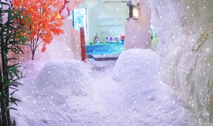 池边堆积着皑皑冰雪,洁白雪花纷飞飘落,热腾腾的温泉雾气不断蒸腾,低至零下8摄氏度的气温和超过40摄氏度的水温相结合,让你感受不一样的冰火交融极致享受,既能避暑,又能养生,极具特色的清凉休闲方式吸引各地游客前来体验。