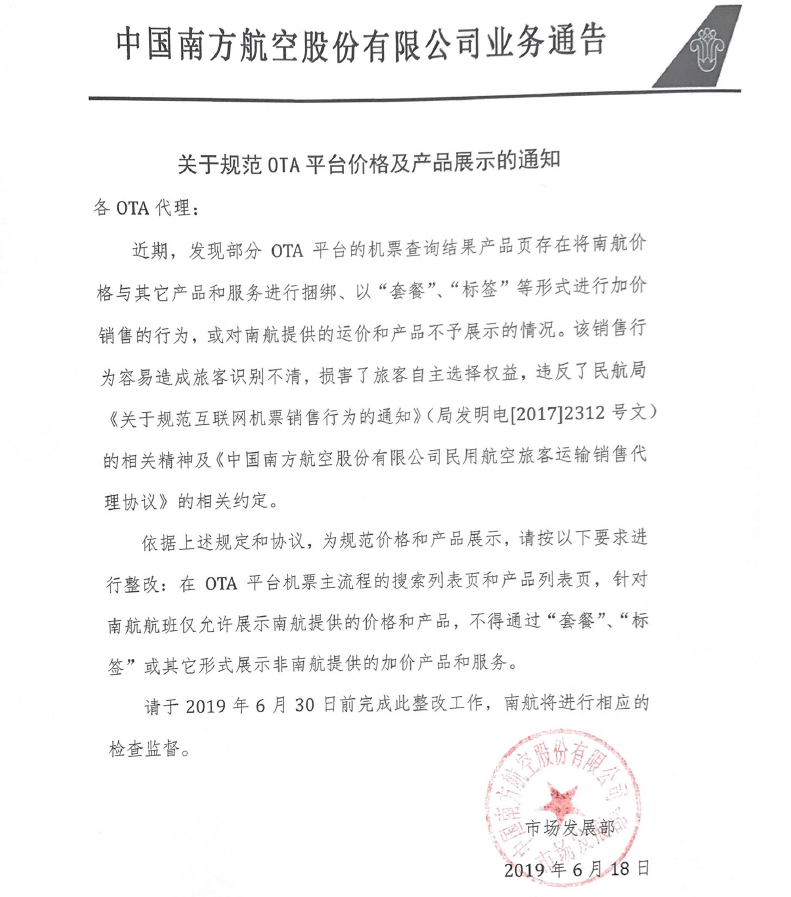 记者了解到,6月18日,南航市场发展部向各OTA代理下发《关于规范OTA平台价格及产品展示的通知》称,近期,发现部分OTA平台的机票查询结果产品页存在将南航机票价格与其他产品和服务进行捆绑,以“套餐”“标签”等形式进行加价销售的行为,或对南航提供的运价和产品不予展示的情况。