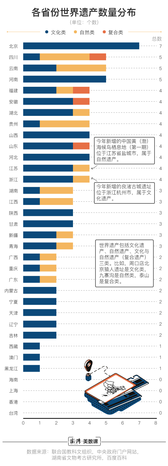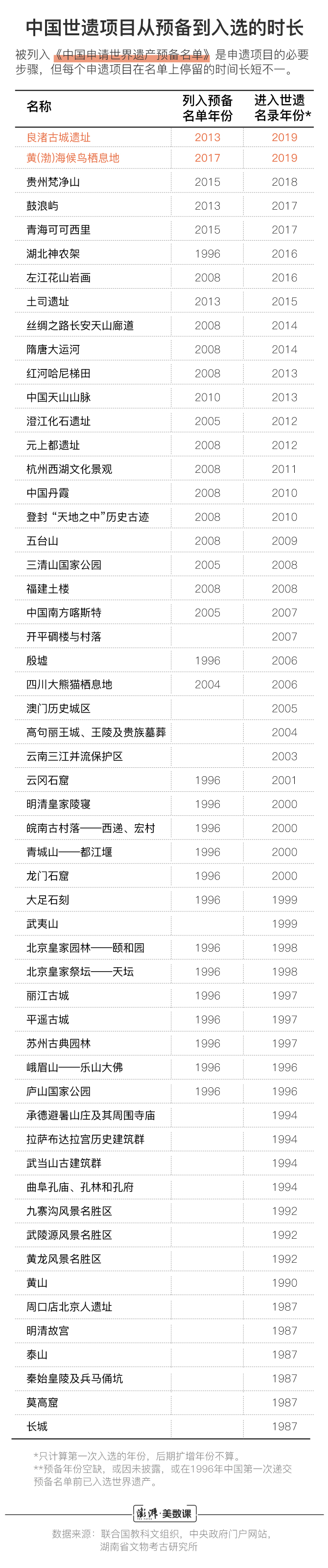 7月5日,第43届联合国教科文组织世界遗产委员会会议决定,中国黄(渤)海候鸟栖息地(第一期)入选世界自然遗产名录。7月6日,位于浙江杭州的“良渚古城遗址”也成功入选。据新华社报道,至此,中国世界遗产总数已达55处,位居世界第一。