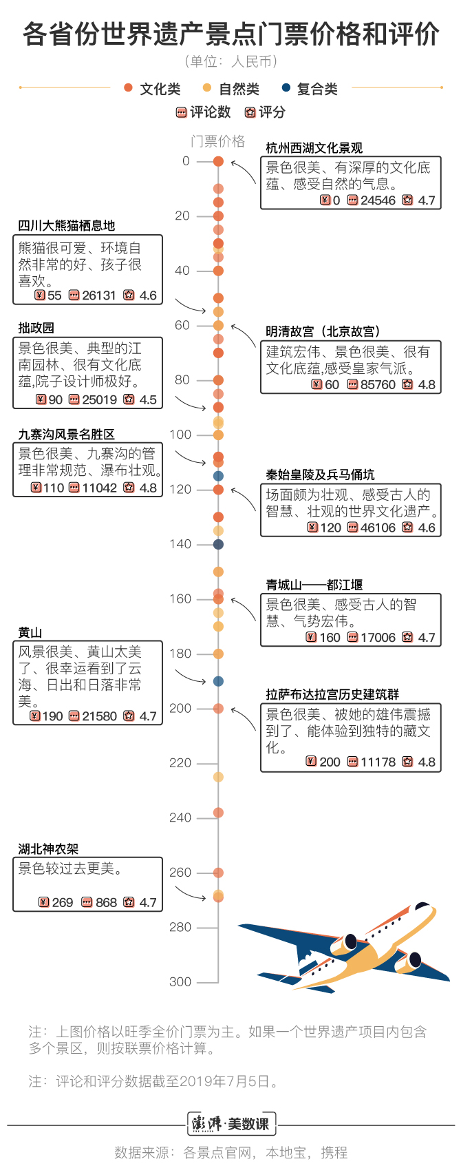 成为世界遗产,不仅能获得多样的保护措施,更重要的是能够提高世界知名度,拉动相关景点的旅游产业。下图整理了各项目的门票价位,发现世界遗产的门票并不一定特别贵。既有接近300元的景点联票,也有随时免费参观的景点。