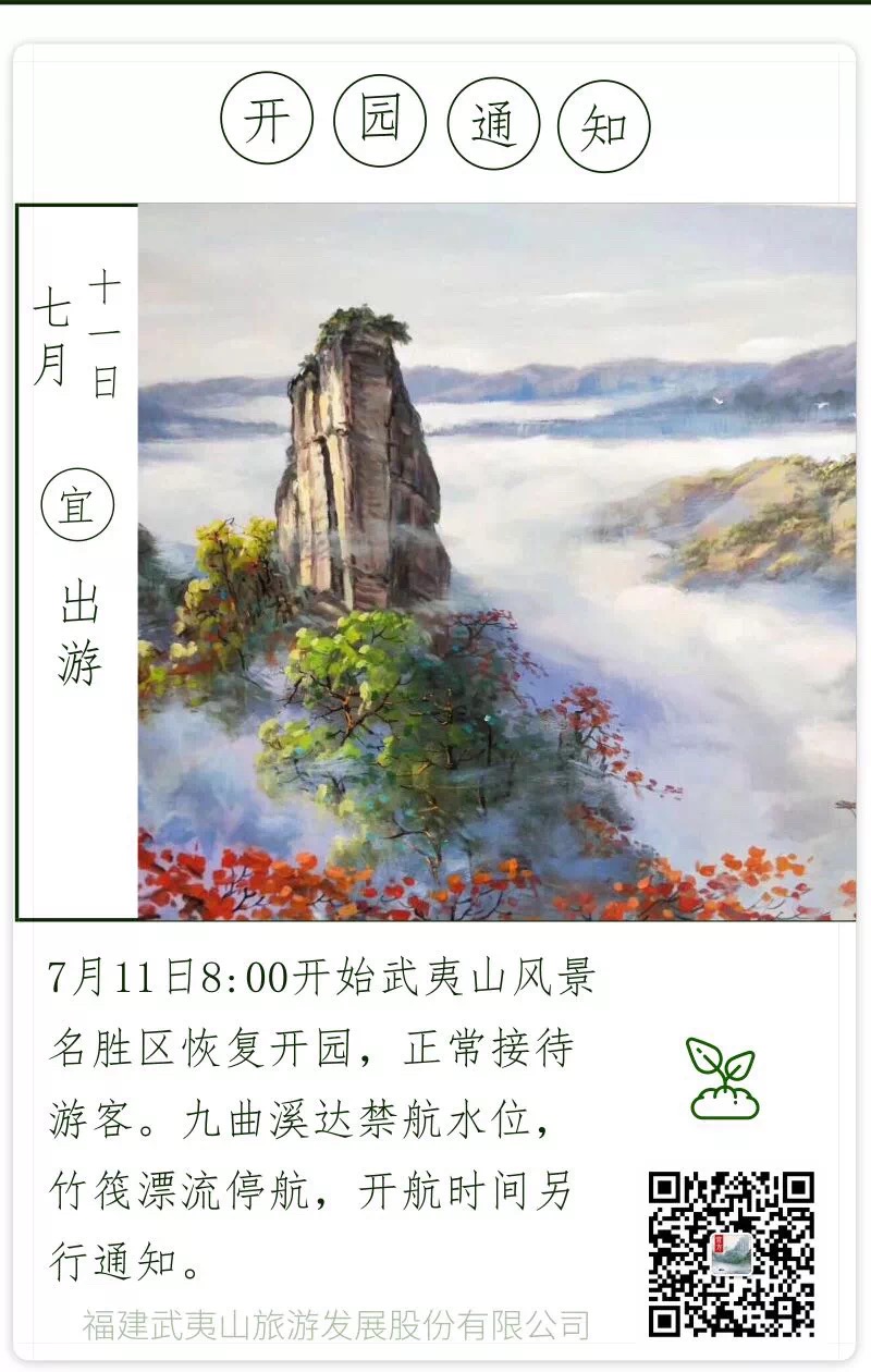 据福建武夷山景区管委会7月10日消息,7月11日8时开始,武夷山风景名胜区恢复开园,正常接待游客。九曲溪达禁航水位,竹筏漂流停航,开航时间另行通知。