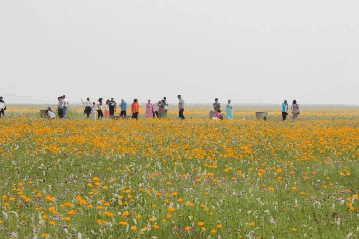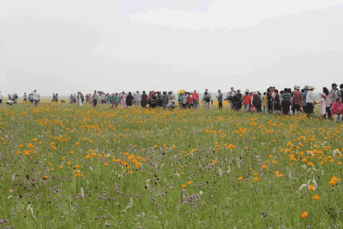 金莲花绽放,映衬着草原上的一抹清绿,整个金莲川草原如诗如画,游客们纷纷流连于花丛草甸之中。