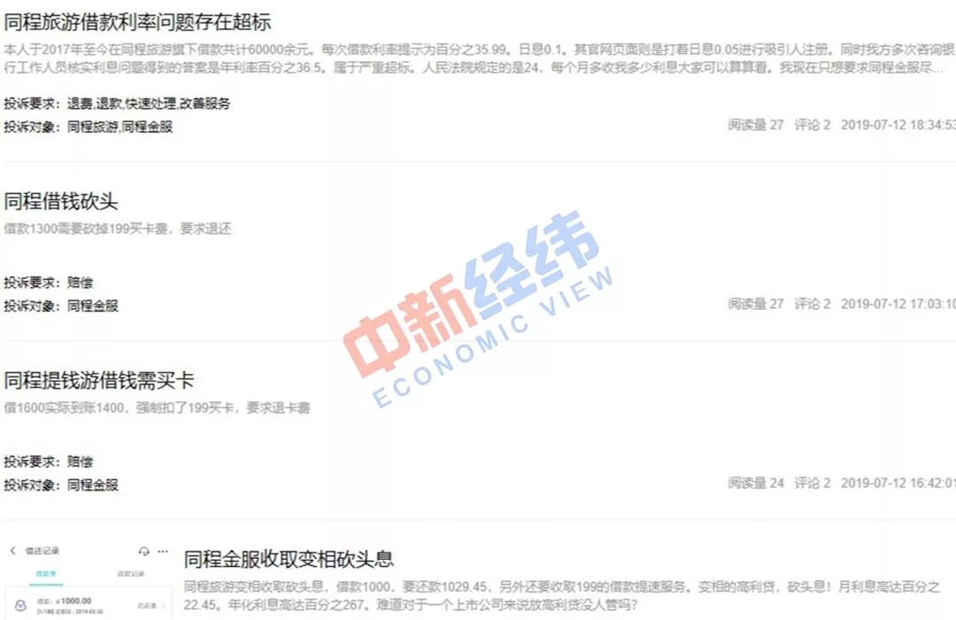 中新经纬在21聚投诉平台上发现,从今年5月至7月,关于同程旅游“砍头息”“暴力催收”等投诉信息多达277条,在黑猫投诉上也有100多条类似投诉。