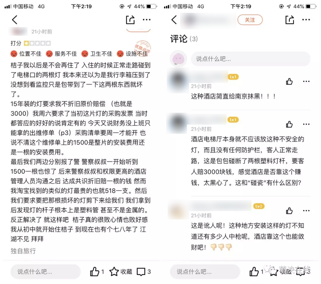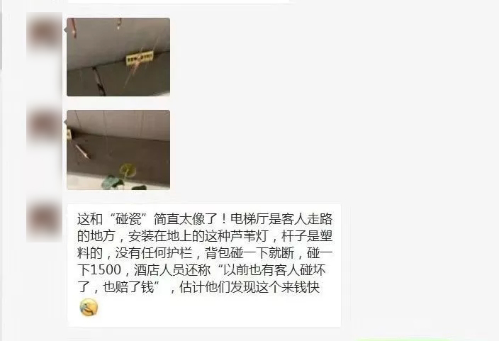 今天,上海的夏女士向反映:7月20号,她到南京看演出,在桔子水晶南京奥体中胜国际博览中心酒店遇到一件让她崩溃的事情:简单来说,夏女士走到电梯间准备等电梯,走的时候没注意,手上的包碰到了电梯口的两根装饰灯,灯的支撑管随即就断了。