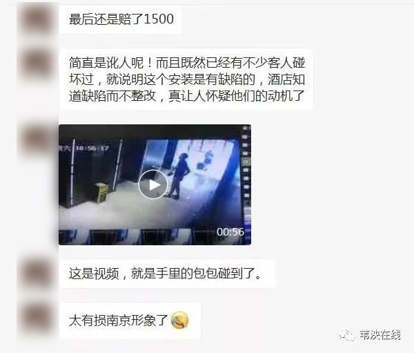 夏女士表示,交涉中,酒店工作人员也说,之前也有类似情况出现,“就这样他们也没有做任何的保护措施。我也看了监控录像,觉得很过分,败坏南京口碑啊!”