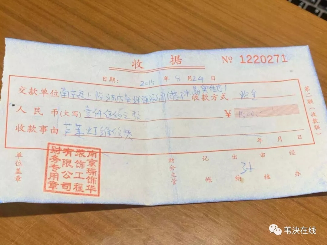 之后酒店就要她赔偿,说这款芦苇灯一根1500元,夏女士损坏了两根,要赔3000元。夏女士要求酒店提供采购清单,然而,酒店只拿出了一张2015年的维修单,但没有显示灯的单价。