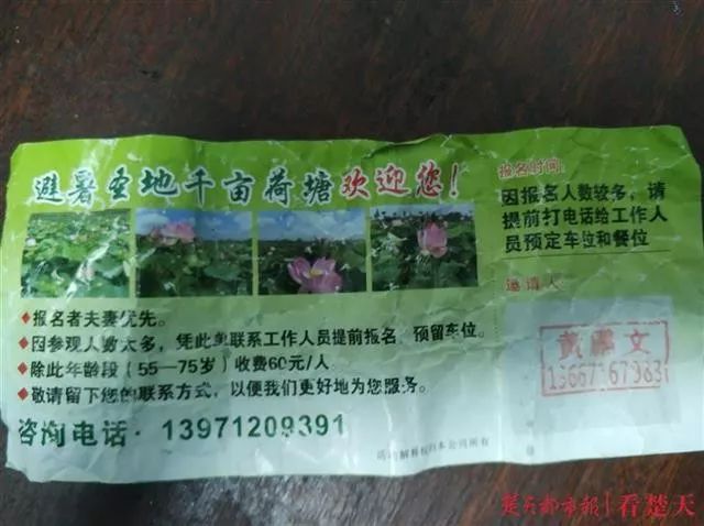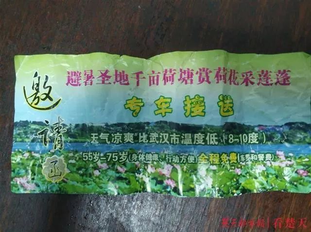 楚天都市报记者在老人家中看到了邀请函。邀请函没有标注避暑的地点,只印着“避暑圣地千亩荷塘赏莲花采莲蓬”,“天气凉爽比武汉温度低(8—10度)。邀请函还称有专车接送,55岁至75岁,身体健康、行动方便的老人全程免车费和餐费。