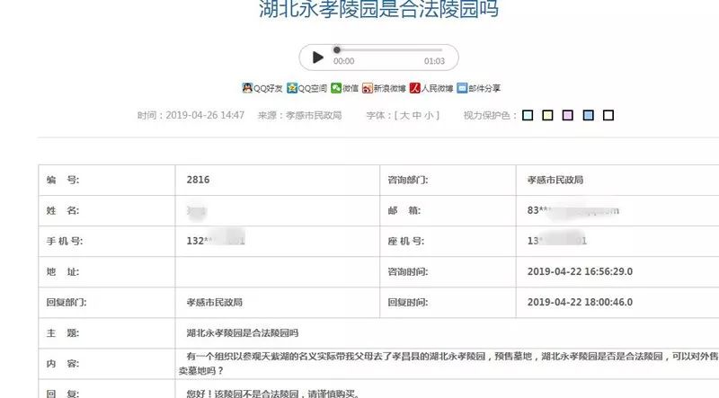 记者拨通邀请函上的咨询电话,对方自称姓白,该陵园在孝昌县天紫湖旁,墓地是新开发的,价格低环境好,价格从两三万元到8.38万元不等。记者发现,该陵园早在今年4月就被网友投诉。在孝感市政府官方网站上,一位网友反映,有人以参观天紫湖名义实际上是带他父母去了孝昌县的永孝陵园,预售墓地。对于网友的提问,孝感市民政局的答复是,该陵园不是合法陵园。