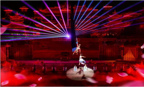 值得一提的是《秦汉·风云》从舞台布景到灯光舞美造型,高科技手段及影视剧特效、特技手法的运用,尤其是中国首例上千平米巨幅LED舞台背景,刷新了中国特色旅游演艺的视觉志。
