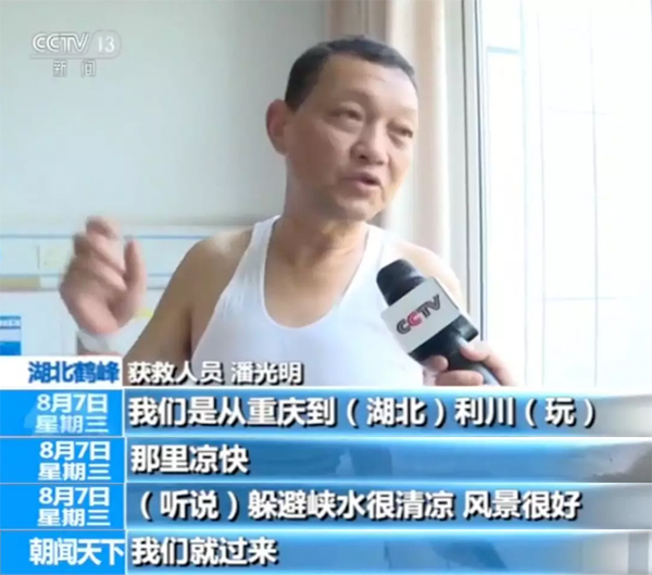 获救人员 潘光明:当时,我们一起的同伴就跟导游说,他们穿救生衣,为什么我们没有。那个导游就说,这里很浅,没有关系。当时也没有预见洪水要下来。