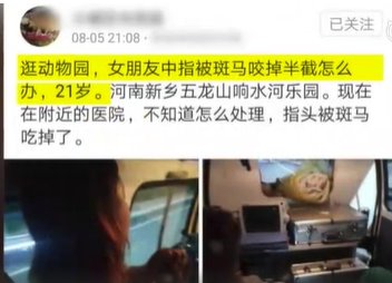 据发布者描述,事情发生在8月5日下午,女友是在辉县市五龙山响水河游乐园被斑马咬掉了手指,并且指头被斑马吃掉了。
