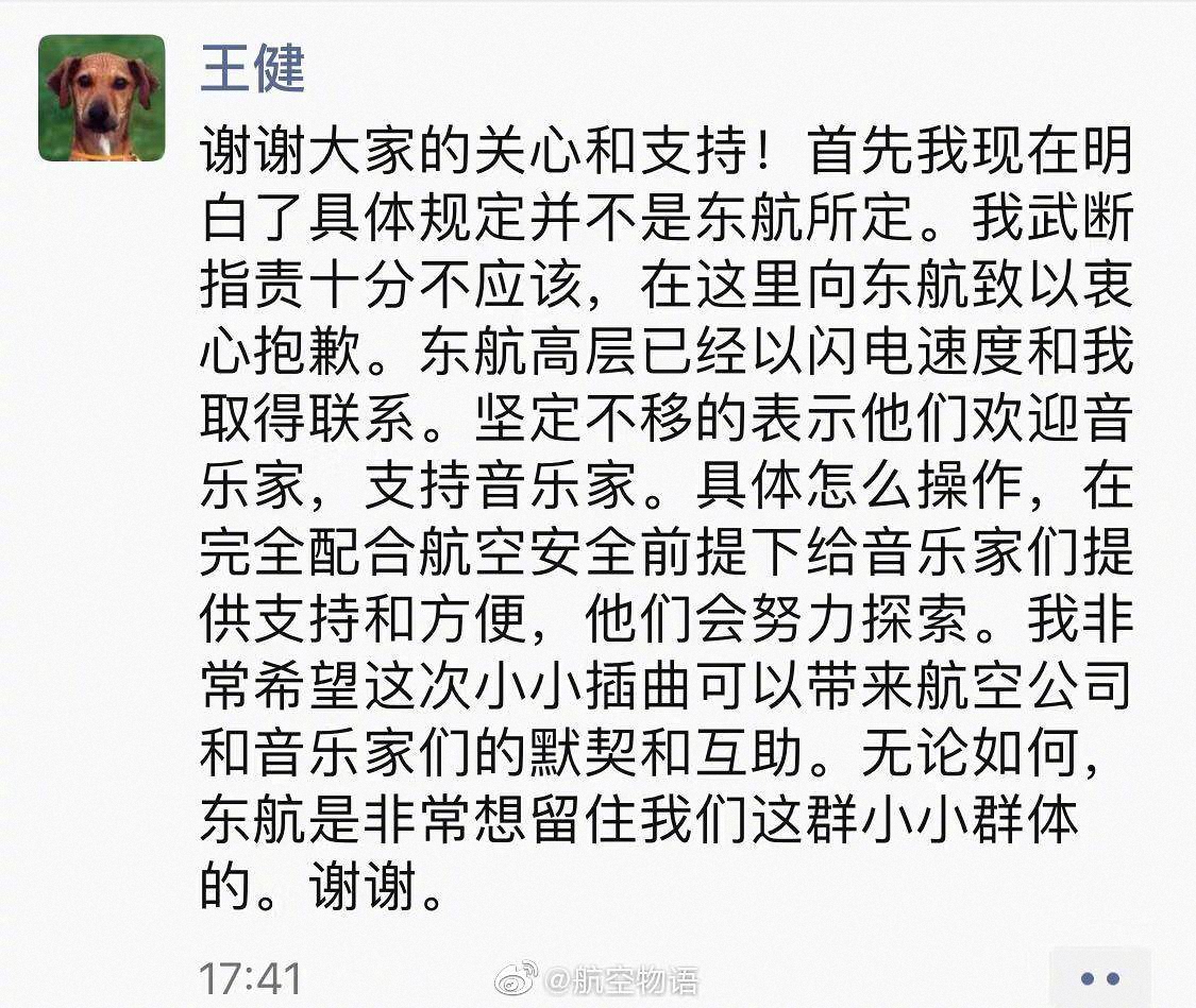 事后经过了解和沟通,王健得知这样的规定并非东航一家航空公司的规定,而是中国民航局的规定,但这样的条文还是引发了音乐界的讨论。