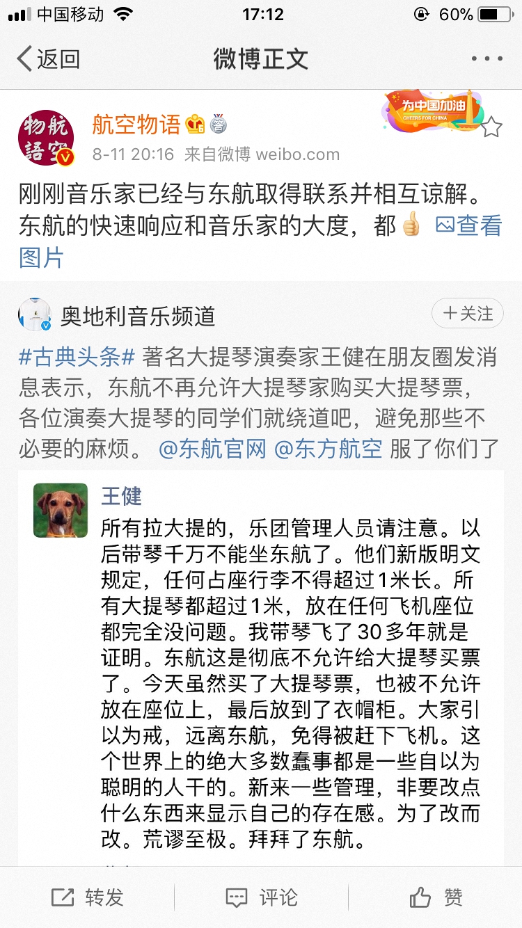一场关于大提琴不能上飞机的“误会”,最终双方选择互相谅解。