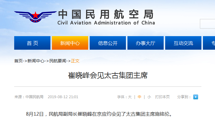 据中国民航局官网消息,8月12日,民航局副局长崔晓峰在京应约会见了太古集团主席施铭伦。