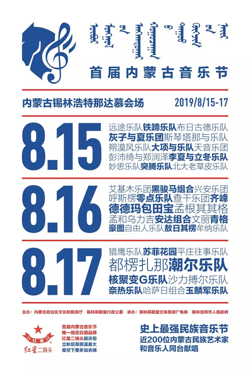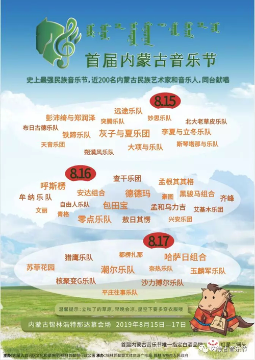 8月15、16日每晚20时在锡林郭勒职业学院国际马头琴学院音乐厅举办野马马头琴乐团专场音乐会,由国际马头琴大师齐宝力高老师领衔演奏。8月17、18日每晚20时,在锡林郭勒歌舞剧院举办内蒙古艺术剧院民族乐团专场民族音乐会。