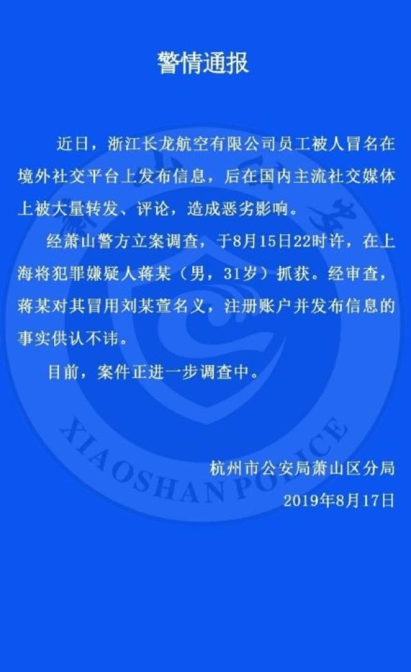 8月15日,浙江长龙航空公司发表声明称,有别有用心者冒用浙江长龙航空员工刘文萱身份注册推特账户,恶意发布不实言论,对长龙航空造成了负面影响。