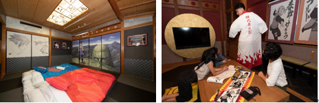 富士急乐园酒店还特别开设了“火影忍者主题套房”,房间共有两种设计风格,分别是以查克拉阳遁为灵感的「阳之间」以及宇智波一家的阴遁为主的「阴之间」,房间内还配以火影主题装饰。