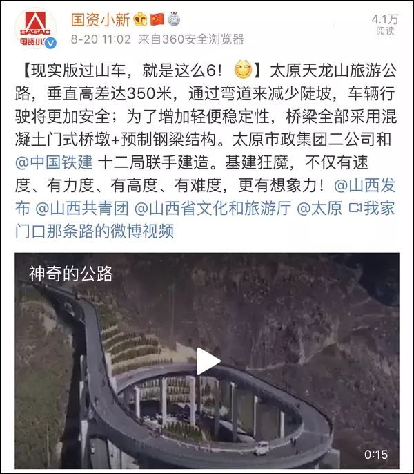 8月20日11点,小新发布微博,向网友们介绍了让天龙山“天堑”变通途的“神器”——太原天龙山旅游公路(后简称天龙山公路)。