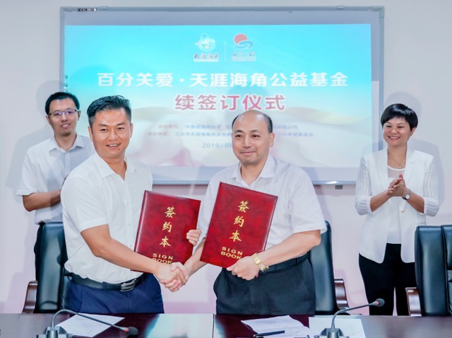 签约仪式上,省青基会理事长兼秘书长羊光然与三亚旅投集团筹备组副组长、天涯海角公司副总经理郑聪辉共同签署“百分关爱·天涯海角公益基金”第二个五年协议,即从2019年1月1日起至2023年12月31日止,天涯海角公司每年将继续从天涯海角游览区门票收入中提取爱心资金,按购票入园人数每人1元计算捐款,五年累计捐款额将达2000万元。