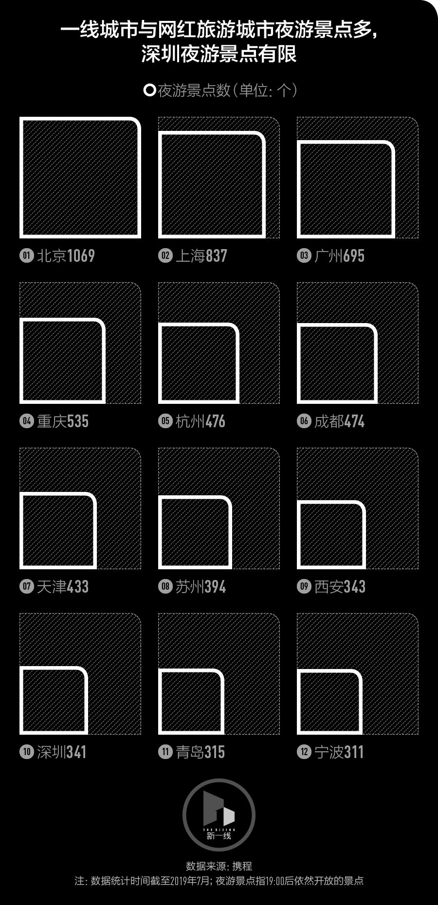 新一酱统计了携程收录的景点开放时间数据,筛选出每个城市19点后仍开放的景点,以此评判城市的夜游景点数量。