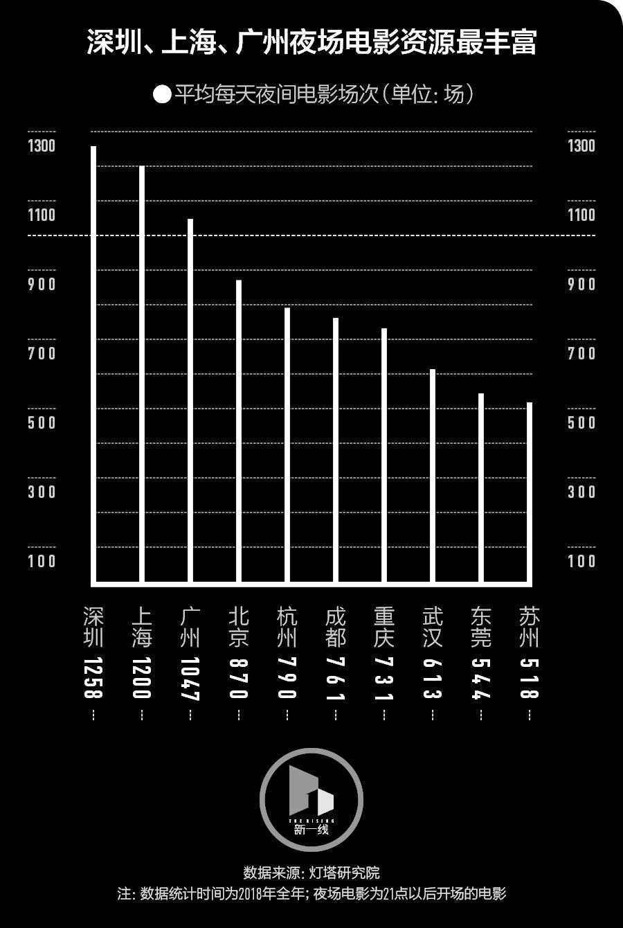 夜场电影和城市夜间的演出场次是新一酱考量城市夜间活动的主要维度。看一场夜场电影是人们最普通、频繁的夜间活动之一。《复仇者联盟4》的0点首映场吸引了超过304万人观看。深圳、上海、广州平均每天能放映超过1000场夜场电影。