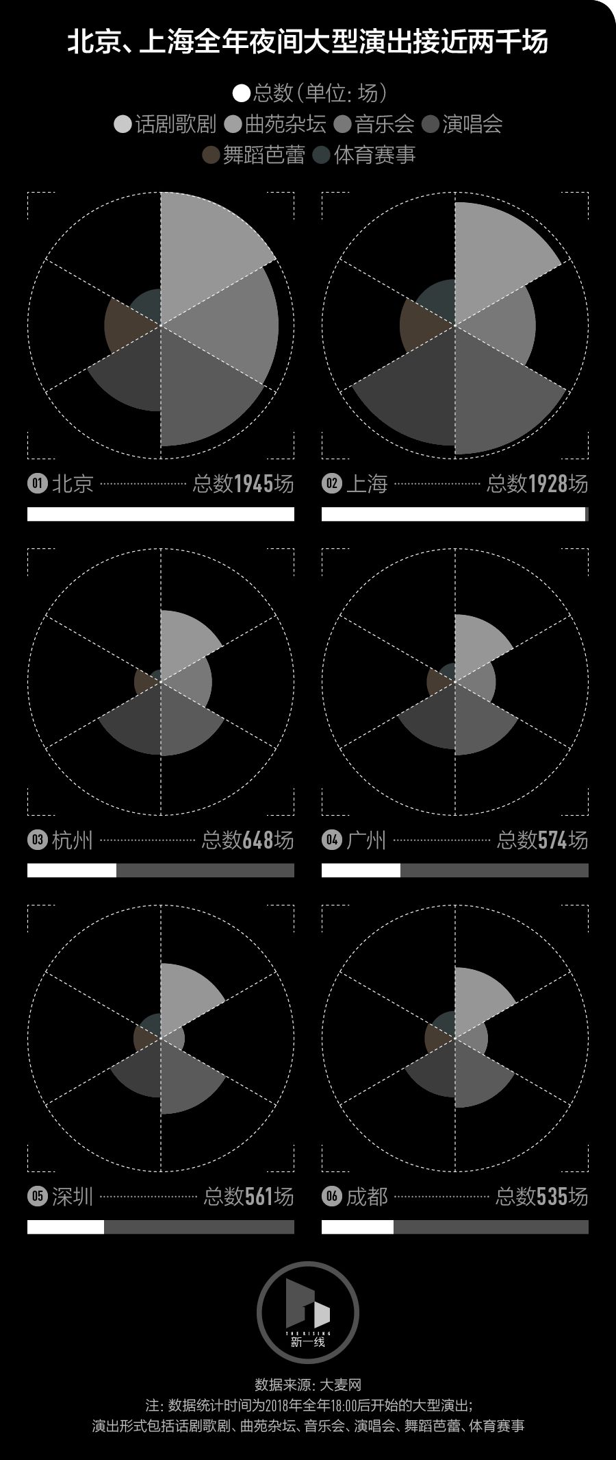 大型演出基本都集中在北京和上海。新一酱统计了大麦网上各个城市的演出时间及类型发现,2018年全年,北京与上海18点后开场的演出数量均接近2000场。“追星圣地”上海的夜间演出中,25%为演唱会,28%为音乐会。在北京,话剧歌剧类演出数量最多,全年有近600场。