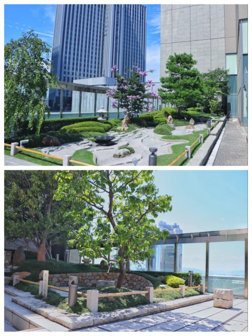 然后来看看这间位于十楼的柔和庭院。微风徐徐伴着传统的日式庭院风格的设计,还可以望到梅田的地标蓝天大厦,优雅与柔和与现代建筑艺术巧妙结合。