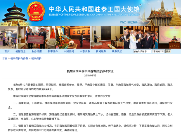 中国驻泰国大使馆已在6月发出提醒,呼吁赴泰中国游客注意涉水安全。尤其指出,下水前务必了解当地海况及天气预警,并提示若不幸遇上离岸流,应保持冷静并立刻挥手或大声呼救,向海滩平行方向游开离岸流。