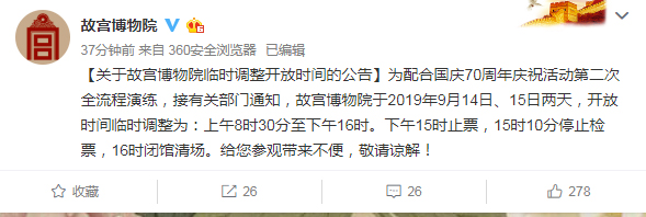 故宫博物院官方微博9月12日发布临时调整开放时间的公告:为配合国庆70周年庆祝活动第二次全流程演练,接有关部门通知,故宫博物院于2019年9月14日、15日两天,开放时间临时调整为:上午8时30分至下午16时。下午15时止票,15时10分停止检票,16时闭馆清场。给您参观带来不便,敬请谅解!