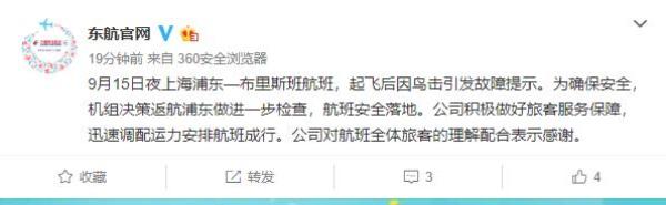 9月16日,记者从东航获悉,9月15日夜上海浦东—布里斯班航班,起飞后因鸟击引发故障提示。为确保安全,机组决策返航浦东做进一步检查,航班安全落地。公司积极做好旅客服务保障,迅速调配运力安排航班成行。