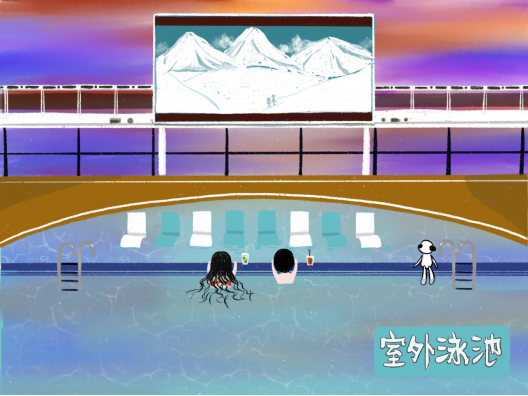 夜幕临降之际,大屏幕上放起电影。老公在露天大泳池里仿佛化身一尾鱼,我则会在池畔酒吧点一杯加好多冰块的酒,舒服窝在大泳池旁侧的按摩泡池里,水温热