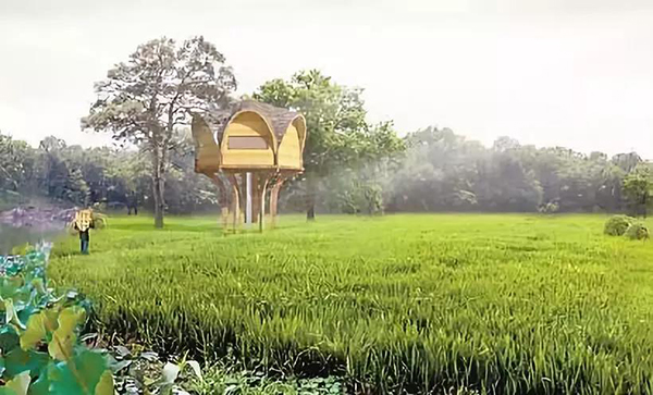 比如说,有一组设计了荷塘中的亭子,它可以供采藕人、游客享受美景。亭子设想用高反射材料组成,碧波水景映射到亭身,它与环境混为一体,仿佛消失在粼粼波光中。