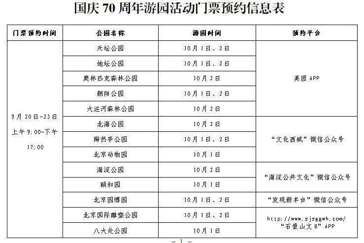 一、10月1日当天,部分收费公园免费开放(名单附后),其中,天坛公园、地坛公园、陶然亭公园、朝阳公园、园博园、北京国际雕塑公园、颐和园、北京动物园、八大处公园等9家公园免费不免票,市民和游客可通过公布的网站、微信公众号、APP 进行预约,并到指定地点兑换门票。当日凭门票入园,其它票证无效。