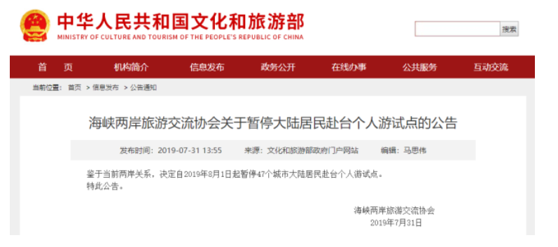 7月31日,文旅部发布《海峡两岸旅游交流协会关于暂停大陆居民赴台个人游试点的公告》,表示,鉴于当前两岸关系,决定自2019年8月1日起暂停47个城市大陆居民赴台个人游试点。