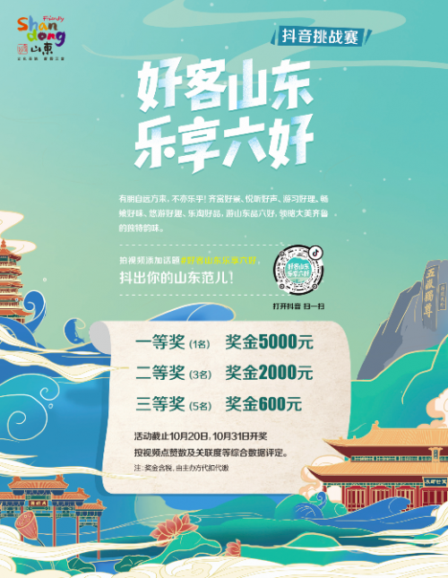山东人在全国自古口碑好,仗义、诚信、憨厚、勇敢。山东礼仪之邦,古风犹存,山东一直以好客形象欢迎八方来客。恰逢金秋时节,好客山东向在山东生活、游玩的朋友发出“挑战”,只要你分享与山东相关的“好看、好听、好学、好吃、好玩、好买”的创意短视频,既有机会赢取现金大奖。