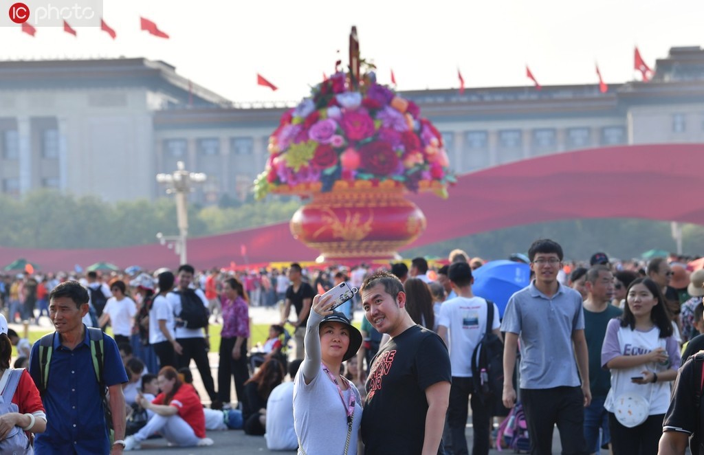 天安门广场迎来参观游览热潮,大批游客来到广场观看国庆花篮。来源:新京报-IC photo