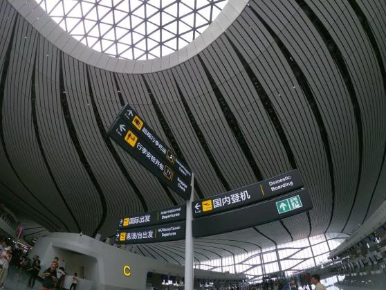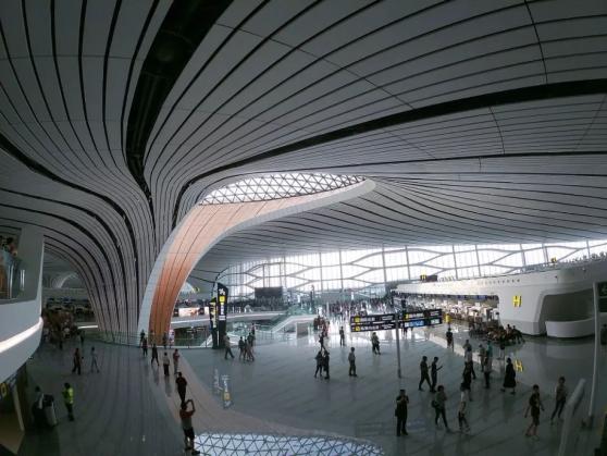 大兴机场的内部空间,以航站楼中心位置为原点,半径90米的范围,都是没有柱子的广阔空间,而且几乎看不到直线,流动的曲线让空间在三维度紧密连通,阳光透过自由曲面屋顶倾泻而入,光影交织中,传递出一种无与伦比的美感,神秘而富有未来感。90米开外,是支撑屋顶的8根C型柱,流畅的线条被C型柱一路引导到地面上,连通了高达49米的屋顶和地面。事实上,航站楼的设计兼具了艺术性和功能性,60%的区域可以实现天然采光,这也体现了大兴机场的绿色理念和人性化设计。