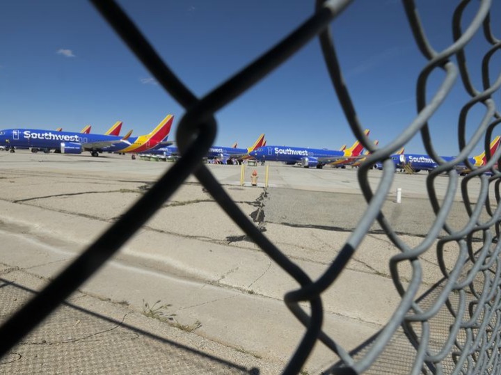 2019年3月27日,在美国加利福尼亚州维克托维尔,美国西南航空公司的波音737 MAX 8型号飞机停泊在南加利福尼亚物流机场。 新华社 发 赵汉荣 摄